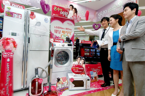 LG전자는 행사기간 동안 품목별 혼수베스트 모델을 제안하며, 700/500/300만원 이상 제품 구입시 금액대별로 테팔 스팀 다리미, 수입 도자기 세트 등을 사은품으로 증정한다.