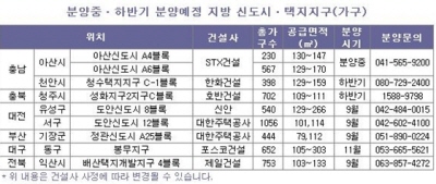 부동산전문업체 스피드뱅크에 따르면, 현재 분양중인 아산신도시 단지를 비롯해 대전 도안신도시와 교통여건 개선 등 호재를 안고 있는 부산 정관신도시가 분양 대기 중이다.