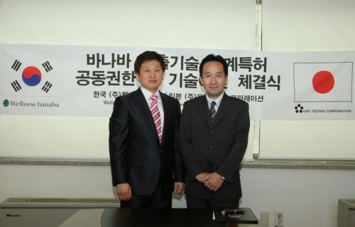 | <사진=웰니스바나바-UTC 기술이전 계약 체결식. 웰니스바나바 김철회대표(왼쪽)와 UTC사 마찌야마 후토시 대표> | ||