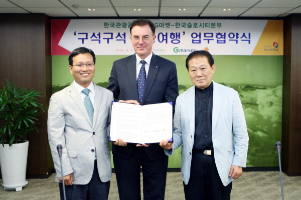 <왼쪽부터 구영배 G마켓 대표, 이참 한국관광공사 사장, 손대현 한국슬로시티본부 위원장> |