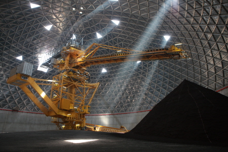 이 원자재창고의 가장 큰 장점은 뭐니 뭐니 해도 원료 적치 효율이다. 현대제철 관계자에 따르면 기존의 개방형 원료처리시설의 적치율은 평당 13톤가량인 반면 돔형 원료처리시설의 적치률은 무려 평당 32톤이나 된다. 현대제철 광진 일관제철소에는 이러한 원형원료저장고가 모두 3동 있다.