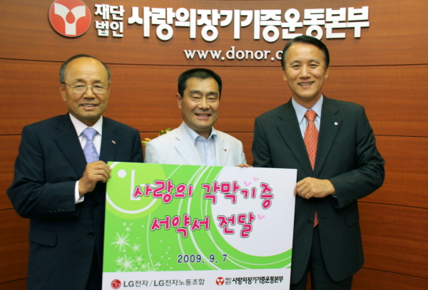 7일 오후 LG전자 박준수 노조위원장, 지원부문장 김영기 부사장, 사랑의장기기증운동본부 박진탁 본부장 등이 참석한 가운데 서울 충정로 운동본부 사무실에서 기증식이 열렸다.