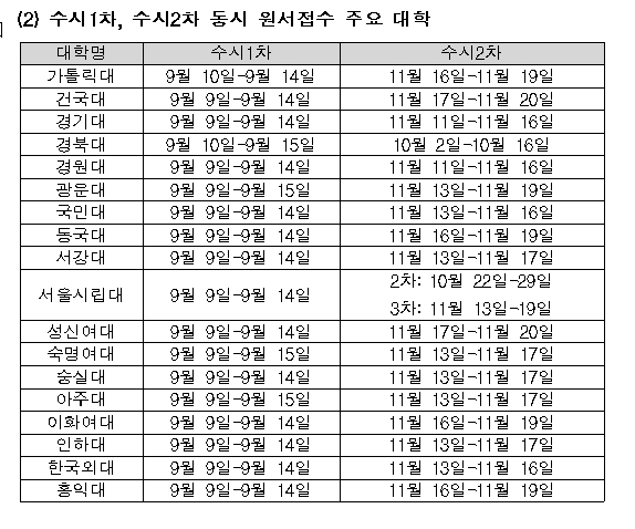 건국대, 동국대, 서강대, 숭실대, 이화여대, 한국외대 등은 수시1차 원서접수는 9월 9일부터 14일까지 실시하고, 수시2차는 수능후인 11월 13일 이후에 원서접수를 실시한다.