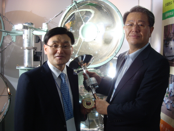 | <사진=김종선 코팩이티에스 부사장(오른쪽)과 최동배 한국전력기술(주) 차장이 3세대 집광형 태양전지를 들고 있다.> | ||