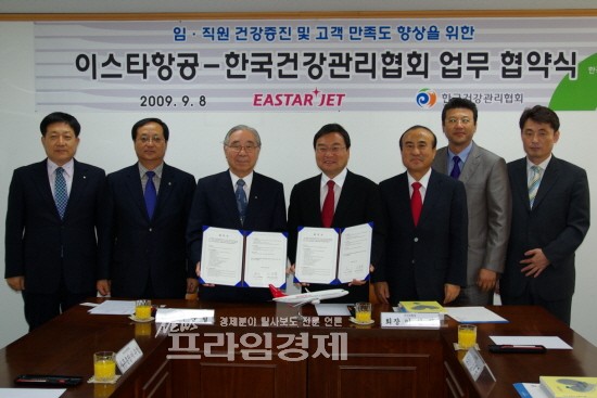 | <사진= 이스타항공그룹 이상직 회장(우측 네번째), 양해구 이스타항공 대표(우측 세번째), 한국건강관리협회 이순형 회장(좌측 세번째)> | ||
