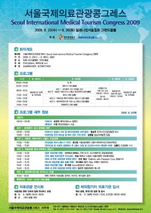 [프라임경제] 한국관광공사(사장 이참)는 오는 24일 서울밀레니엄힐튼호텔에서 국내외 의료관광 에이전트, 의료기관, 관련인사 300명이 참가한 가운데‘서울국제의료관광콩그래스(Seoul International Medical Tourism Congress 2009)'를 개최한다.