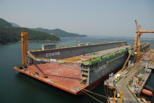 ‘로얄도크 Ⅳ’로 명명된 이 초대형 해상 플로팅 독은 길이 438m, 너비 84m, 높이 23.5m로 세계에서 가장 큰 규모를 자랑한다. 이는 여의도 63빌딩 두 개를 이어 붙인 것과 같은 길이다. 면적 또한 어마어마하다. 축구장 5개 크기와 맞먹는다.