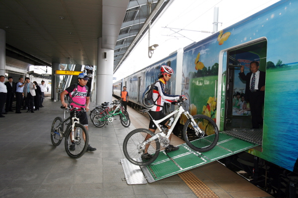 [프라임경제]코레일은 9일 대전역 승강장에서 국내 최초 ‘에코레일 자전거열차’를 공개했다. 이번에 공개된 자전거열차는 최대 288명을 수용할 수 있는 객실 4량과 자전거 거치용 전용객차 4량으로 편성됐다. 코레일 관계자는 “자전거 거치용 전용객차에는 산악자전거(MTB)와 일반자전거 모두 거치가 가능하다”고 말했다. 코레일은 자전거열차를 철도110주년을 기념해 오는 12일 서울~경주 구간으로 특별 운행할 예정이다.