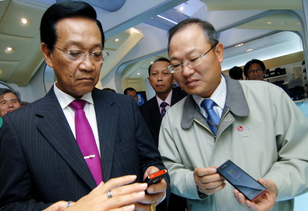 | <LG전자 MC생산담당 이웅범 부사장이 10일 오후 LG전자 평택사업장을 방문한 하멩꾸 부워노 10세에게 블랙라벨시리즈 4탄 뉴 초콜릿폰을 소개하고 있다.> | ||