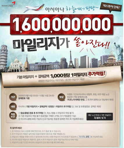 이에 따라 이번 프로모션 기간 동안 넥스투어에서 아시아나항공을 구매하면 기본 탑승 마일리지 외 추가 아시아나항공 마일리지 적립 혜택을 얻을 수 있을 뿐 아니라 할인항공권 같이 기본 마일리지 비 적립 상품도 넥스투어에서 제공하는 추가 마일리지 혜택을 얻을 수 있다.