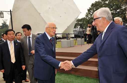 이탈리아 외무장관 프랑코 프라티니, 주한 이탈리아 대사 마시모 안드레아 레게리와 함께 프라다 트랜스포머를 찾은 나폴리타노 대통령은 프라다 그룹의 CEO인 파트리지오 베르텔리의 영접을 받았다.