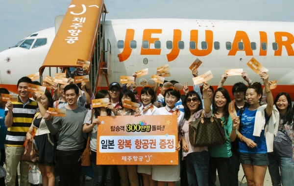 [프라임경제] 취항 4년차의 제주항공이 누적탑승객 300만명을 돌파했다. 제주항공은 300만명을 돌파하는 14일 오전 김포발 제주행 7C109편 탑승객 모두에게 이 회사가 취항하고 있는 일본(인천~키타큐슈) 왕복항공권 1매씩을 증정하는 기내 이벤트를 실시했다.
