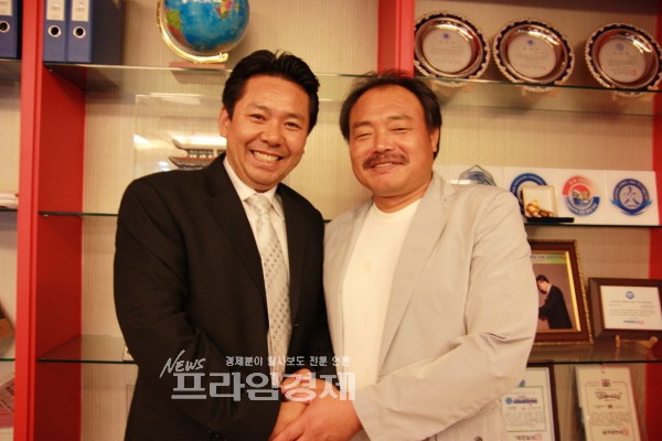 | <사진=광고모델 계약 체결 후 악수를 하고 있는 김흥국 씨와 파이소 이찬석 대표> | ||