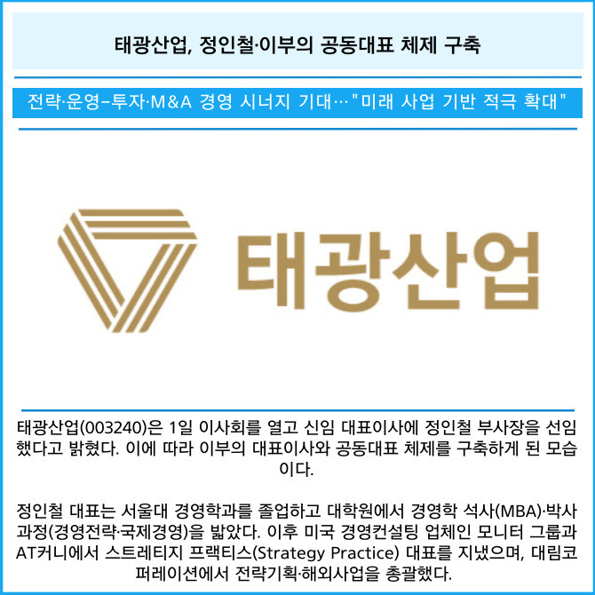 [카드] 태광산업, 정인철·이부의 공동대표 체제 구축