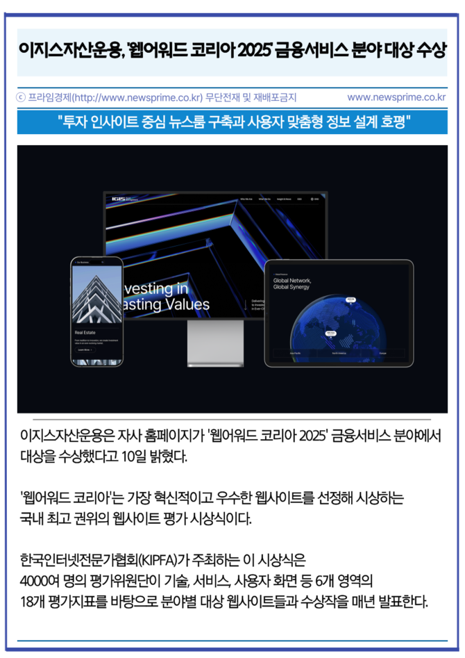 [카드] 이지스자산운용, '웹어워드 코리아 2025' 금융서비스 분야 대상 수상