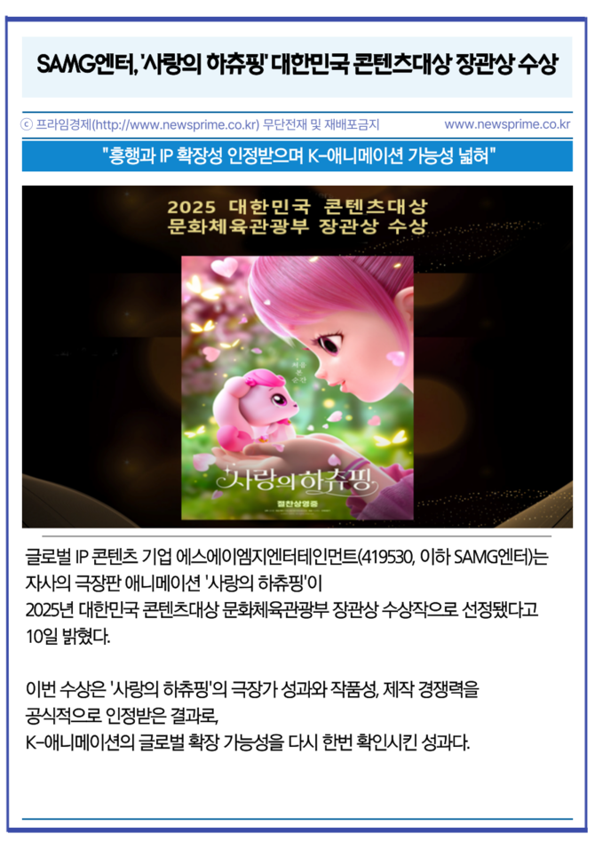 [카드] SAMG엔터, '사랑의 하츄핑' 대한민국 콘텐츠대상 장관상 수상