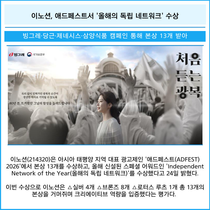 [카드] 이노션, 애드페스트서 '올해의 독립 네트워크' 수상