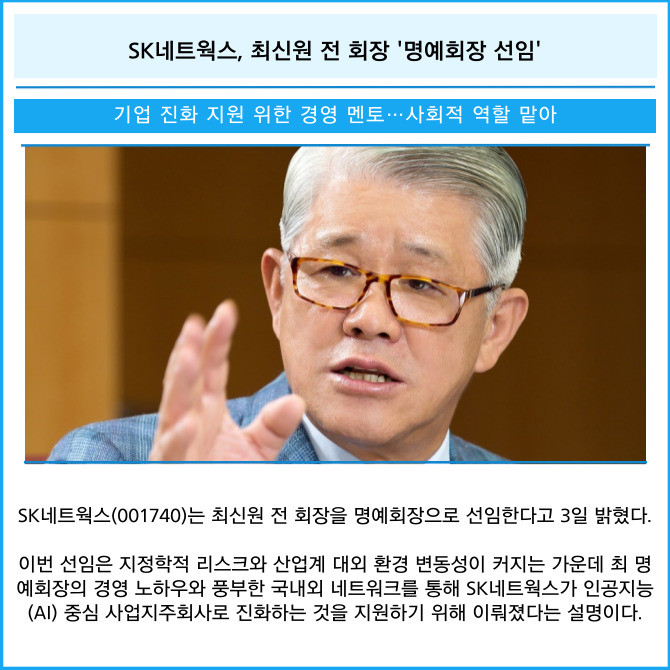 [카드] SK네트웍스, 최신원 전 회장 '명예회장 선임'