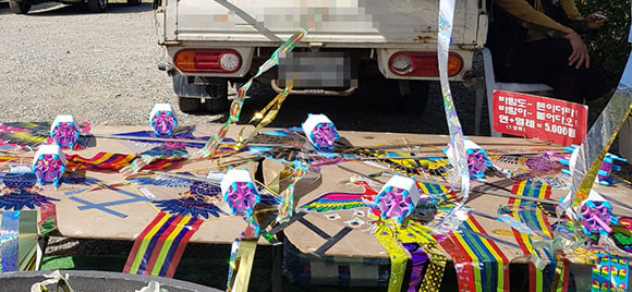 이 사진은 연을 팔고 있는 상인의 모습을 찍은 것입니다. 트럭뒤 연을 판매하는 곳에 세워진 팻말에 눈길이 갔습니다.
