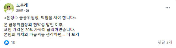 노 의원은 23일 본인의 SNS 계정으로 "금융위원장의 협박성 발언 후 코인 가격은 30% 가까이 급락했다"며 "본인의 위치와 파급력을 생각하면 정말 참을 수 없는 발언의 가벼움으로 볼 수 있다"고 강조했다.