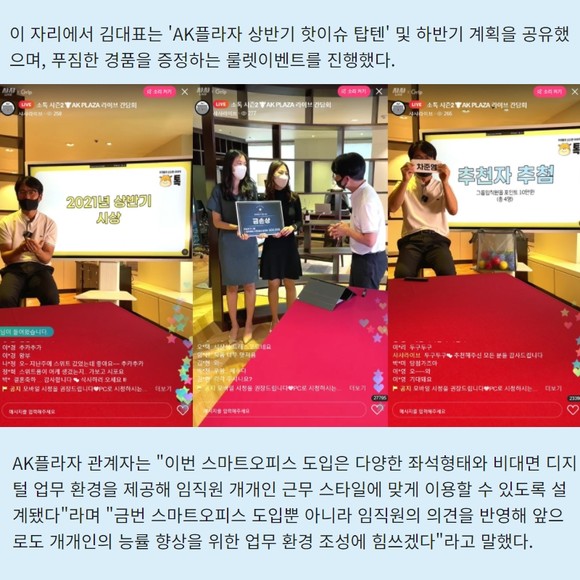 이번 시행된 AK플라자 스마트오피스는 자율좌석제로 운영된다. 팀이나 직급에 상관없이 본인의 업무 특성을 고려해 원하는 자리에서 업무가 가능해 업무의 효율성을 높인다. 또한, 과거 부서별로 나누어졌던 공간을 하나의 오픈된 공간으로 통합해 부서를 넘어 직원간 자연스러운 소통 환경을 조성한다.