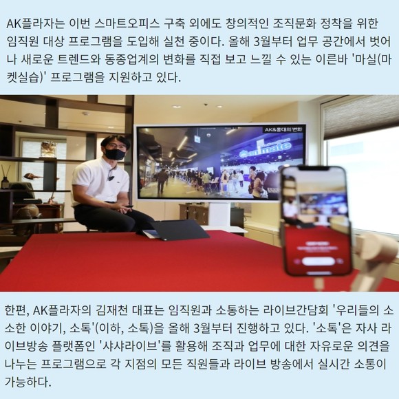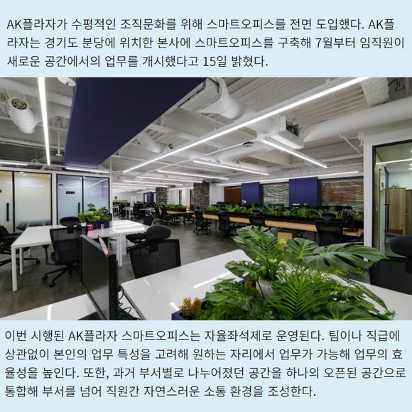 [프라임경제] AK플라자가 수평적인 조직문화를 위해 스마트오피스를 전면 도입했다. AK플라자는 경기도 분당에 위치한 본사에 스마트오피스를 구축해 7월부터 임직원이 새로운 공간에서의 업무를 개시했다고 15일 밝혔다.