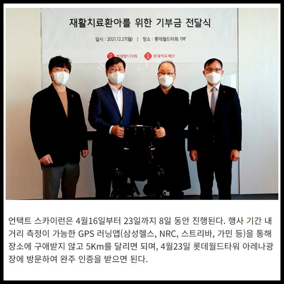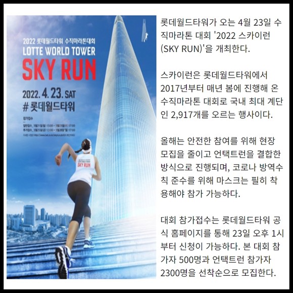 스카이런은 롯데월드타워에서 2017년부터 매년 봄에 진행해 온 수직마라톤 대회로 국내 최대 계단인 2,917개를 오르는 행사이다. 올해는 안전한 참여를 위해 현장 모집을 줄이고 언택트런을 결합한 방식으로 진행되며, 코로나 방역수칙 준수를 위해 마스크는 필히 착용해야 참가 가능하다.