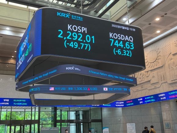 6일 서울 영등포구 여의도 한국거래소 전광판에 코스피지수가 전장대비 49.77p(-2.13%) 하락한 2292.01을 나타내고 있다. 이는 지난 2020년 11월2일 이후 약 1년8개월 만에 2200선으로 내려앉게 됐다. = 이정훈 기자