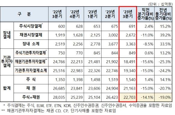 채권시장 밖에서 채권 등 매매에 따른 기관 간의 채권·대금의 결제를 의미하는 채권기관투자자결제 일평균 결제대금은 18조5000억원이다. 직전 분기 대비로는 15.6% 쪼그라들었다. 거래대금은 26조1000억원으로 14.9% 감소했다.