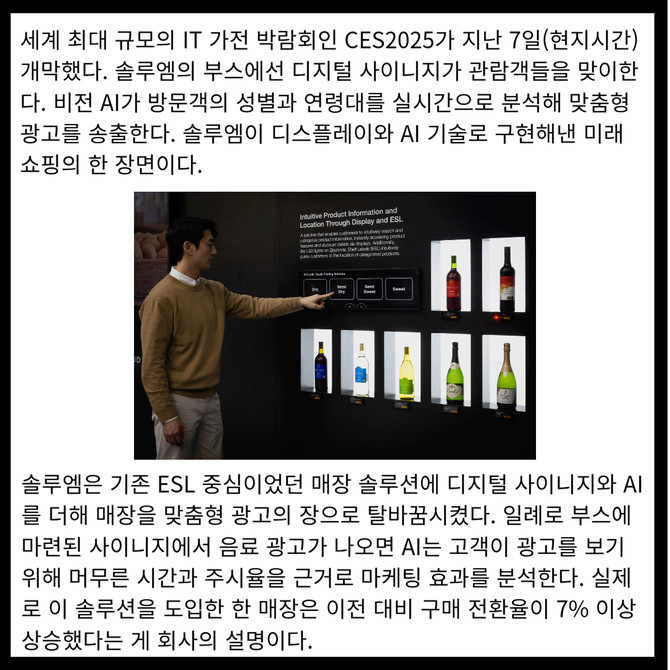[프라임경제] 세계 최대 IT 가전 박람회 CES2025에서 솔루엠은 디지털 사이니지와 AI 기술을 활용한 맞춤형 광고 솔루션을 선보였다. 이 기술은 방문객의 성별과 연령대를 실시간으로 분석해 효과적인 마케팅을 지원하며, 실제 적용된 매장에서 구매 전환율을 7% 이상 향상시켰다고 밝혔다.
