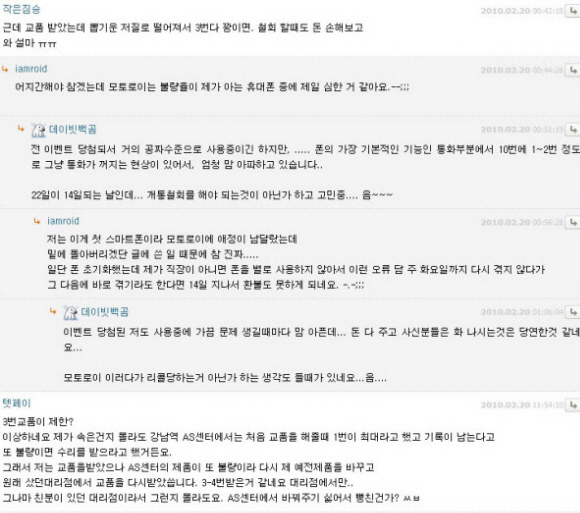 일각에서는 '모토로라가 급히 출시를 하는 바람에 한국인들이 베타테스터(실험대상)가 되고 있다'는 의심까지 하고 있다. 상용화된 양산폰이 아닌 시제품으로 착각마저 든다는 혹평도 여럿 나온다.