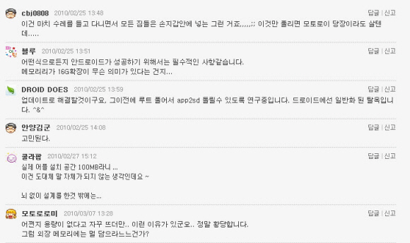 하지만 문제는 현시점에선 이조차 거의 가능성이 없다는 데 있다. 모토로라 홍보 대행사측의 해명에 따르면 "현재 외장 메모리 지원 문제는 검토되지 않고 있다"는 상황이고, 이에 따라 향후 얼리 어댑터들에 대한 지원 대책 역시 답이 없는 상황이라고 할 수 있다.
