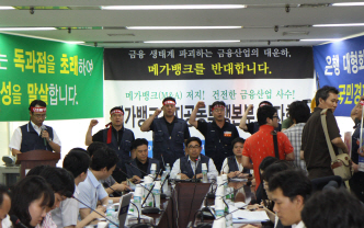 | <사진=금융권 구조조정 이슈가 본격적으로 떠오르고 있다. 사진은 6일 메가뱅크저지투쟁본부 회견장면> |