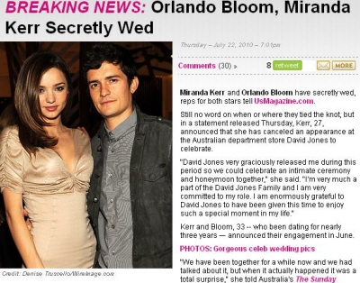 | <비밀리에 결혼식을 올린 미란다 커와 올랜도 블룸 소식을 전한 US매거진> | ||