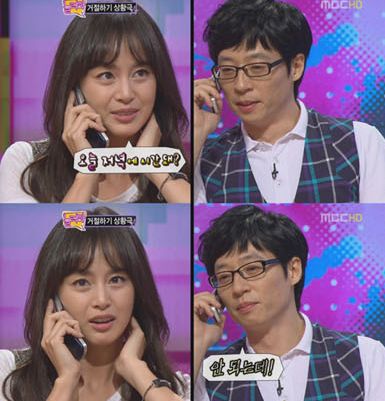 이날 게스트로 참여한 김태희는 "애교가 없다"고 밝혔고, 이에 유재석은 상황극에 들어갔다. 유재석은 시크남으로, 김태희는 그를 짝사랑하는 여인으로 변해 전화통화를 시도했다.