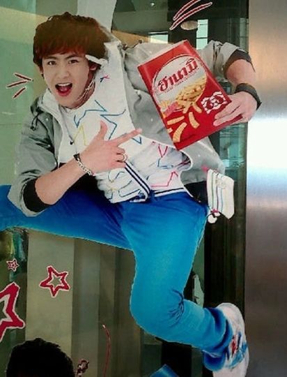 닉쿤은 지난 21일 자신의 트위터에 "yumm yumm"이라는 글과 함께 태국에서 촬영한 CF 사진을 게재했다. 사진 속 닉쿤은 과자 봉지를 들고 펄쩍 뛰어오르는 모습이다.