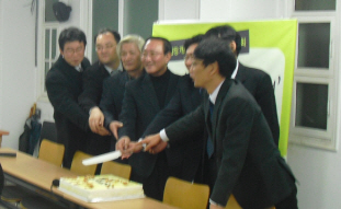 | 여러 진보계열 정당 관계자들이 참석한 가운데 연구소 개소 기념 떡을 자르고 있다. | ||