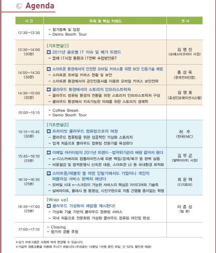 이번 행사에선 김영진 포레스트리서치코리아 사장이 ‘2011년 IT시장 동향과 IT전략 수립방안’을, 홍성욱 한국전자인증 차장이 ‘스마트폰 환경에서의 모바일 커머스를 위한 공인인증서 활용 방법’을, 그리고 김영호 효성인포메이션시스템 차장이 ‘클라우드 환경에서의 스토리지 인프라스트럭처 구성 전략’ 등이 국내 처음으로 소개될 예정이다.