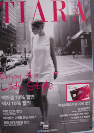 | 우리은행·우리V카드의 '티아라 카드' 선전 포스터. 하지만 막상 선전 내용을 들여다 보면 자사의 New 우리V카드를 거의 카피한 데다 여성 특화 포인트가 없다시피 하다는 분석이다. | ||