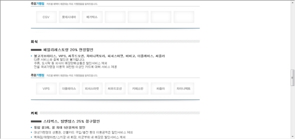 외식 할인의 경우와 놀이동산 및 극장 할인에서도 범위가 같거나, 오히려 New 우리V카드쪽에서 할인업체가 더 넓게 나타났다(티아라 카드 고객은 ‘카페소반’과 ‘더스테이크하우스’에서 할인 대상이 아니다).