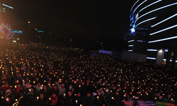 | 하나금융의 인수 추진에 반발, 촛불 집회 중인 외환은행 노조원들. 합병 매듭 내내 진통이 예상되는 것은 물론, 인수가 된 후에라도 차기 행장으로 납득하기 어려운 인사가 오는 경우 더욱 강한 반발이 우려되고 있다. | ||