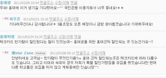 해당 체크카드 소지 고객에게 대학 인근 점포 이용시 할인 혜택을 주는 문제도 배꽃존, 눈꽃존(이화여대와 숙명여대 인근 락스타존)에서 시도돼 많은 관심을 모았으나, 이후 다른 점포에서는 실제로 착수되지 않고 있는 것으로 알려졌다는 답변이 나온 바 있다. 앞으로 이런 주머니 사정이 가벼운 대학생을 위한 맞춤 혜택이 확장되지 못하면 이전에 대학가에서 자리잡은 타은행 지점들에 비해 큰 강점이 없다는 우려도 나온다.