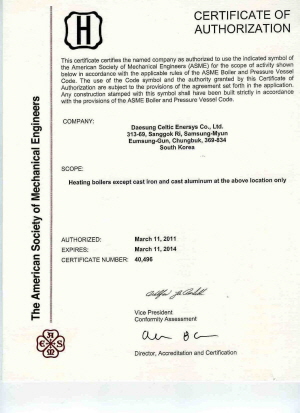 대성쎌틱은 이번 인증을 통해 콘덴싱 보일러에는 ‘H 스탬프’를, 콘덴싱 온수기에는 ‘HLW 스탬프’를 각각 각인할 수 있게 됐으며 이는 해당 제품의 세계적인 품질 보증을 의미한다. 미국 일부 주는 이 인증을 받지 못한 보일러는 판매할 수 없는 등 ASME 인증에 대한 공신력은 그 신뢰도가 매우 높다.