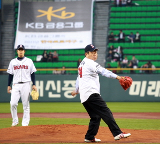 | KB금융그룹 어윤대 회장이 금융데이 행사를 맞아, 시구를 하고 있다. | ||