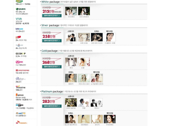 제휴 서비스 업체로 삼고 있는 OK웨딩의 서비스는 가입을 해 보면 플래너와 상담을 통해 진행하게 돼 있다. 그런데, 하나은행의 하나웨딩클럽 관련 서비스를 통해 이를 사용하게 되면, 패키지 구매시 일정액을 할인한다고 돼 있다. 액면상으로만 보면, 특정 금융서비스를 이용하는 고객들이 혜택을 받는 것이라고 볼 수 있다.