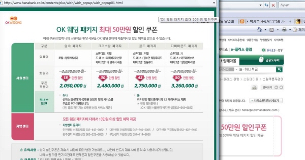 다만 하나웨딩플랜과 관련한 자료는 이 같은 접근이 아니라 하나은행의 소원 적금 고객이 쿠폰꾸러미를 여는 경우에 결혼컬설팅 관련 혜택으로 ‘일부’ 열람하거나, 하나SK We카드 상품의 구성 요소 중 하나로서의 하나웨딩플랜 링크를 타고 접속하는 방식 외에는 허용되지 않는다.
