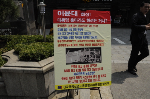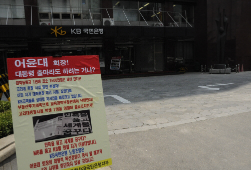 | KB국민은행 본점 앞에 KB금융 어윤대 회장의 행보에 반대하는 판넬 게시물이 전시돼 있다. | ||