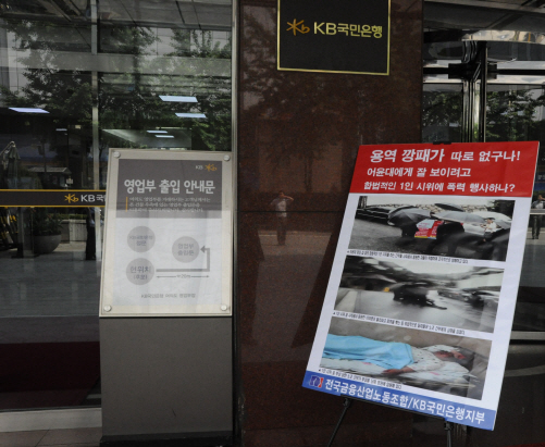 | KB국민은행 노조는 어윤대 회장 자택 앞에서 1인 시위 중이던 노조원이 회사 관계자로 보이는 인물들에게 폭행을 당했다며 이를 비판하는 판넬도 함께 게시했다. | ||