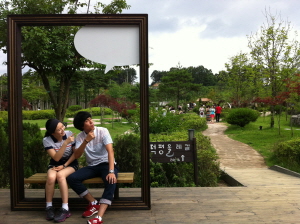 | 덕평자연휴게소에 설치된 ‘프레임 스타’는 휴게소 풍경을 배경으로 연인과 다정한 포즈를 취할 수 있다. | ||