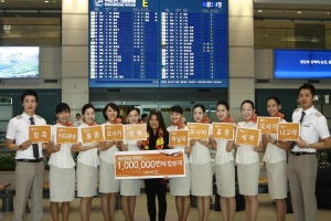 이날 100만번째 탑승객으로 선정된 태국출신 린티다 랑라지트파칸(24세) 씨는 친구들과 서울 관광을 위해 제주항공을 이용해 한국을 방문한 길에 행운의 주인공으로 선정됐다. 제주항공은 린티다 랑라지트파칸 씨에게 인천-방콕 2인 왕복항공권을 선물로 증정했다.